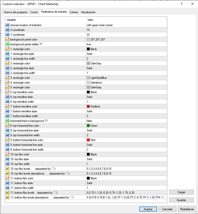 Desde ajustes, podrás determinar estas configuraciones. Dispones de cuadrados vacíos, rellenos, líneas, líneas horizontales, y 2 Fibonacci que podrás tener con 2 configuraciones de niveles y descripciones distintas.