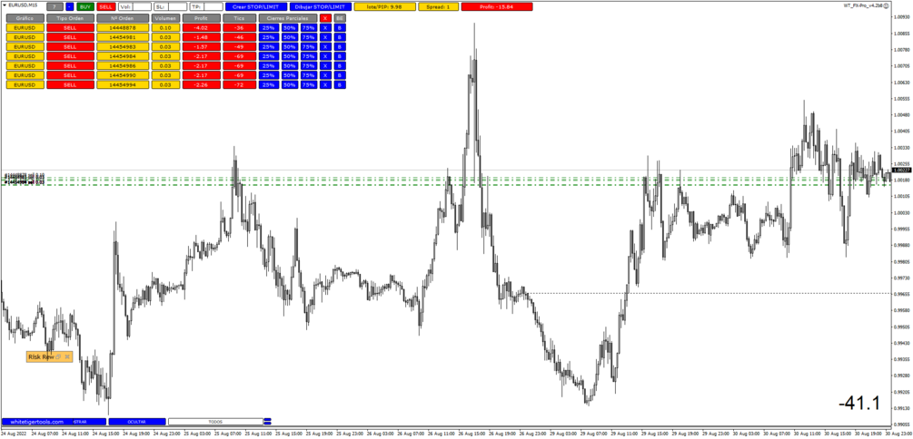 Una herramienta que para traders como yo que operan a diario, y en muchas ocasiones, abrimos muchas órdenes para ir gestionando el riesgo y nuestra operación a medida que esta avanza, este EA me permitirá de un solo click seleccionar una o varias órdenes a la vez en ponerlas en BE, o realizar un Traling Stop, o cobrar 25% ó 50% ó 75% de una o varias órdenes con un solo click, y muchas más utilidades.