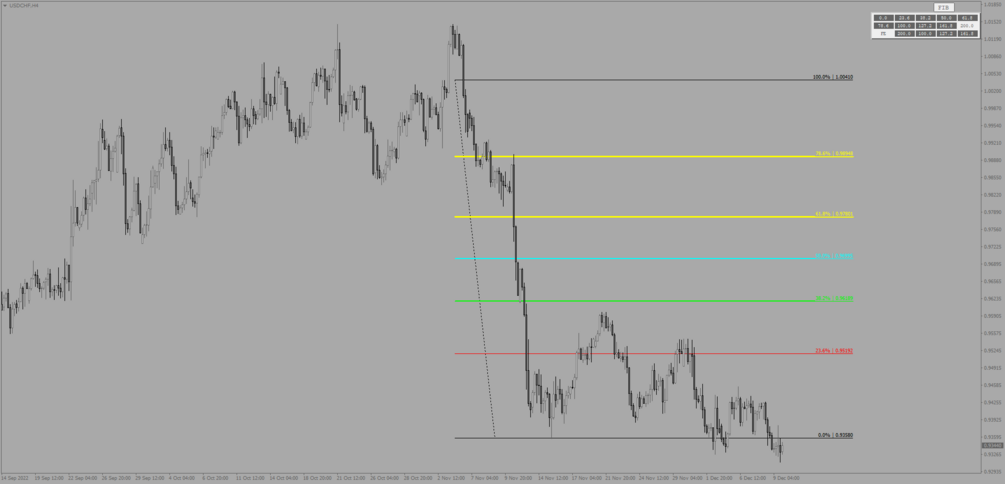 Este sencillo indicador cuenta con un dashboard situado en la parte superior derecha del gráfico que te permitirá configurar rápidamente los niveles de Retroceso y Expansión de Fibonacci que deseas que se muestren en la herramienta.