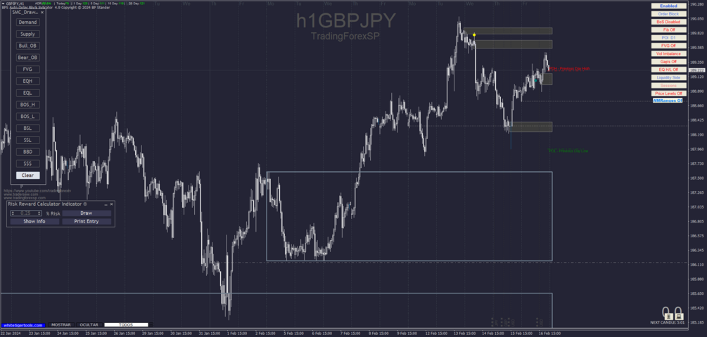 Una de las características más destacadas de este indicador es su capacidad para dibujar los distintos conceptos en el gráfico mediante botones intuitivos. Algunos de estos conceptos incluyen Order Blocks, Liquidez, Imbalances e Ineficiencias, Sesiones de Trading, Kill Zones, Silver Bullet, Previos Day, Week and Month High and Low, Liquidez entre sesiones, Gestión de ratios riesgo beneficio, Gaps, EQH y EQL, POI o Puntos de Interés, Bos & Choch (Break os Structure y Change of Character), entre muchas otras herramientas útiles.